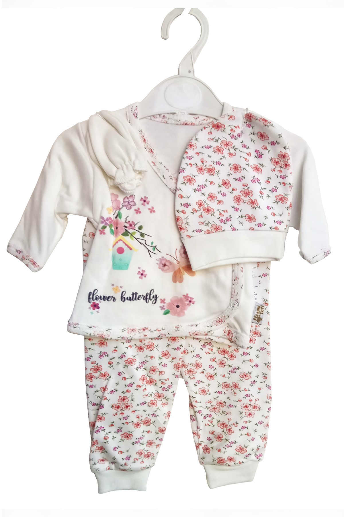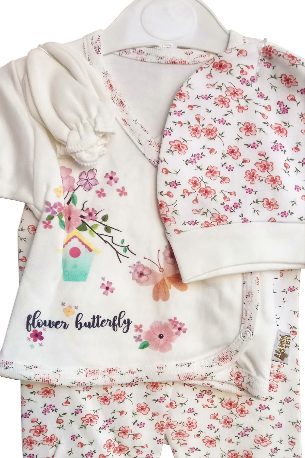 Kelebek Baskılı Çiçek Desenli Pamuk Kumaş Yeni Doğan 5 li Kız Bebek Zıbın Takım