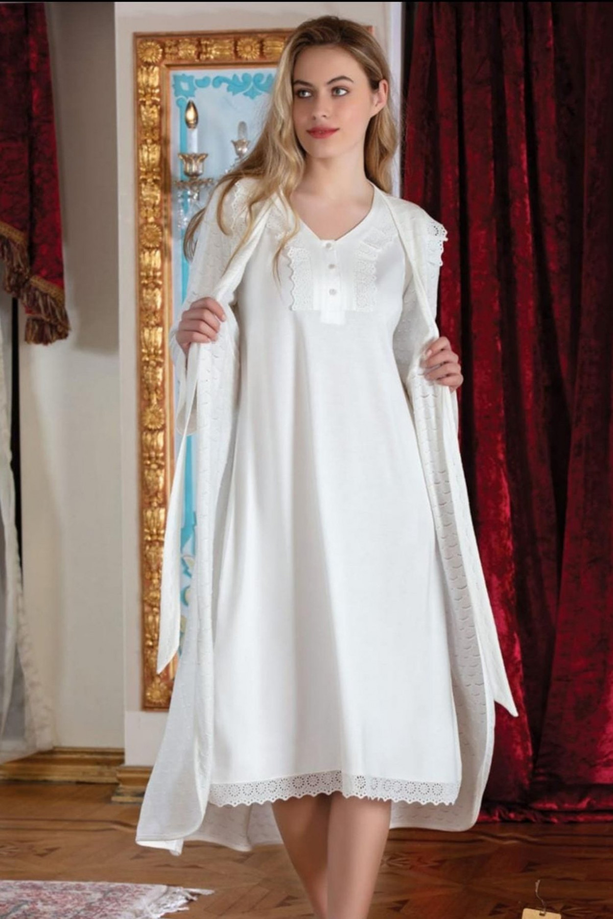 - Geceliği dantel detaylarla süslü, hamile/lohusa döneminde emzirme kolaylığı sağlaması için derin patlı ve karın bölgesi pileli tasarlanmıştır