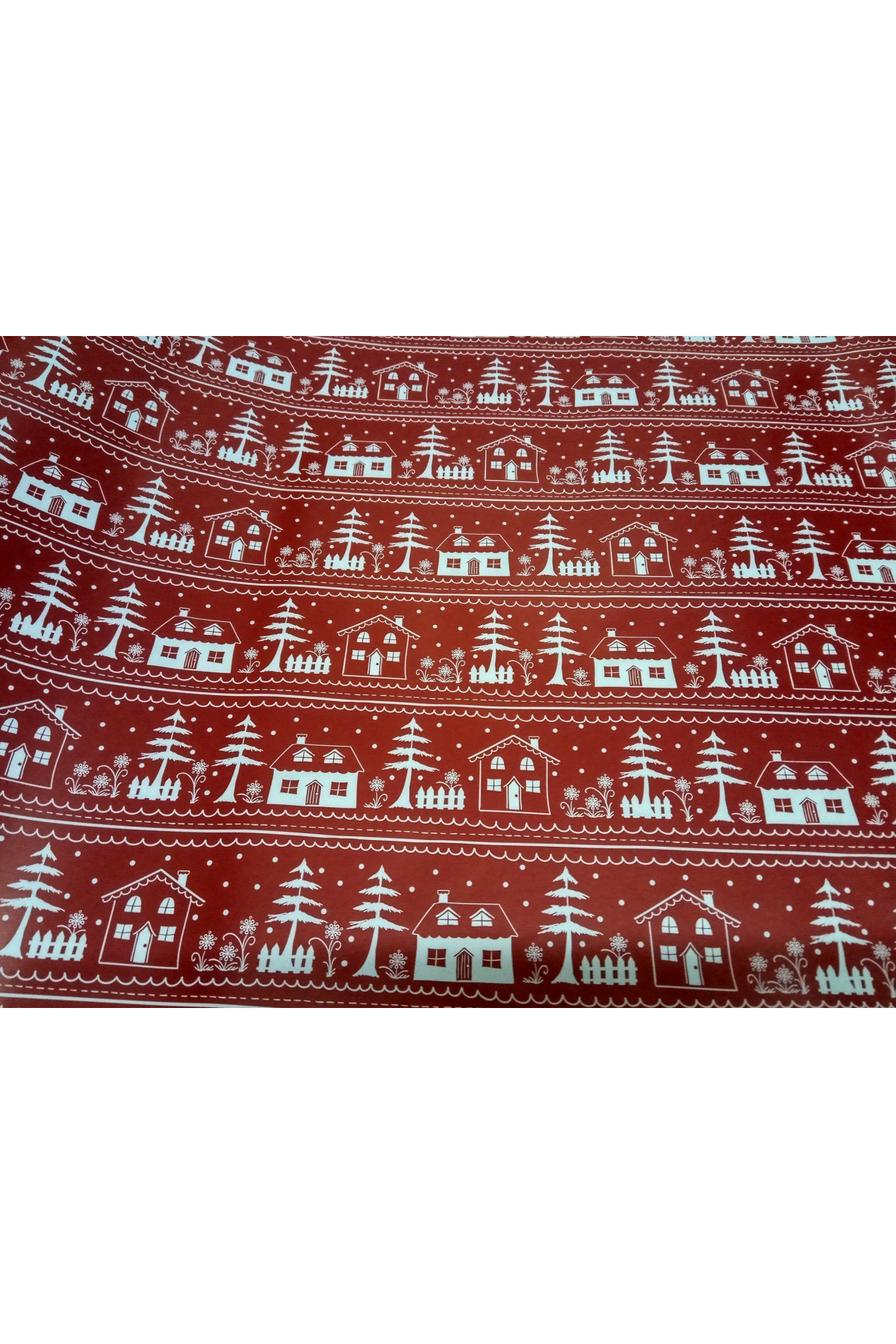 Kırmızı zemin üzeri evler ve ağaçlar desenli hediye paketleme ve ambalaj kağıdı,