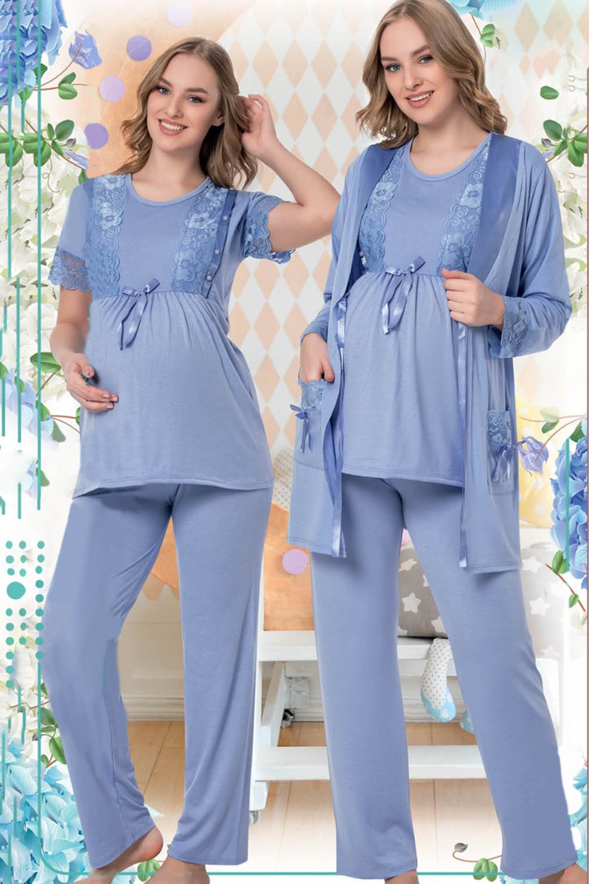 3 lü Sabahlıklı Hamile Pijama Takımı - Açık Mavi Renk Jenika 35734 Sabahlıklı Lohusa Pijaması