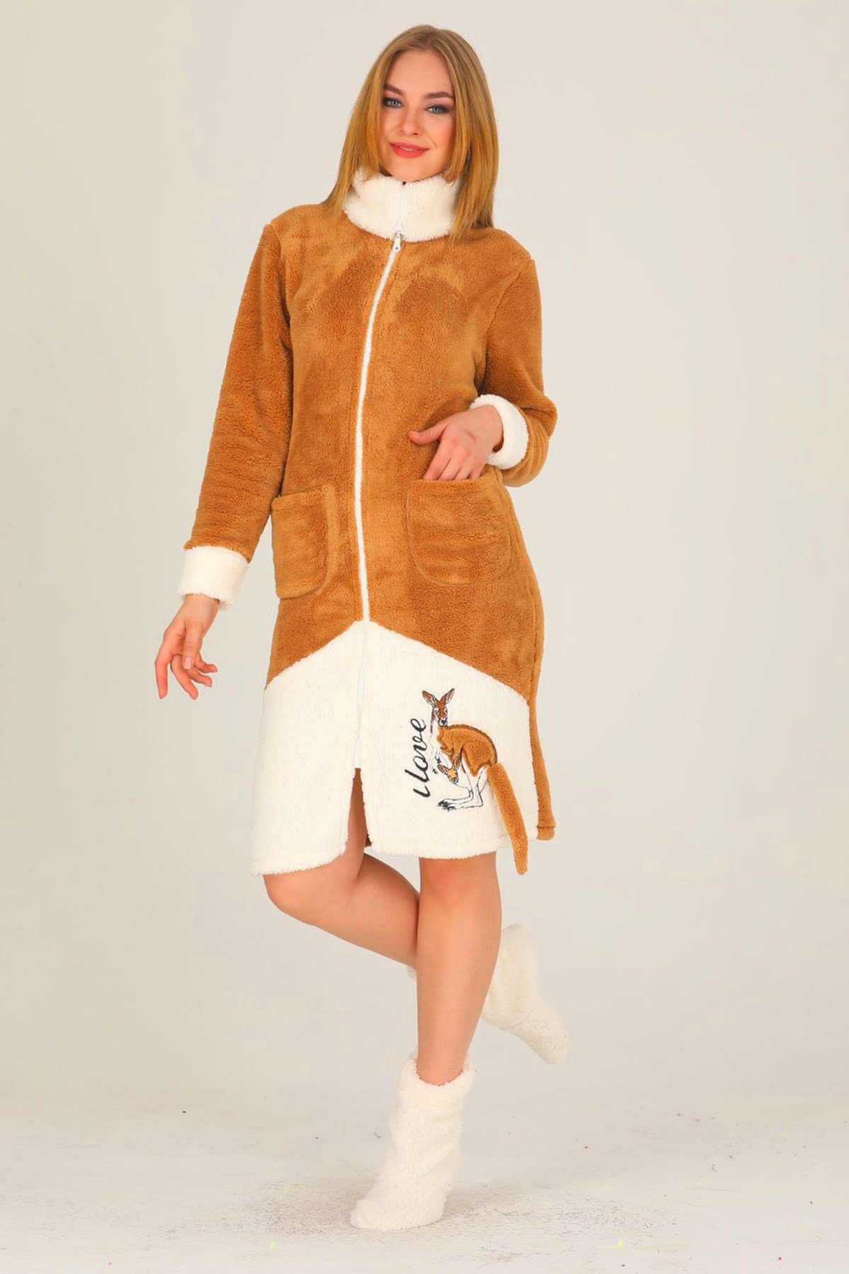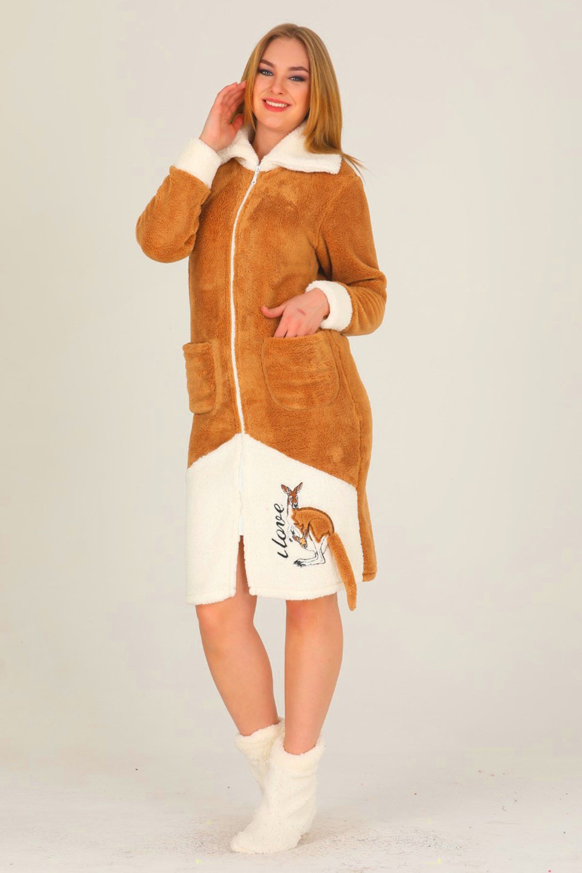 Kadın Kahverengi - Beyaz Renkli Welsoft Kumaş Tunik & Sabahlık - Teknur 59080 Fermuarlı Bayan Welsof..
