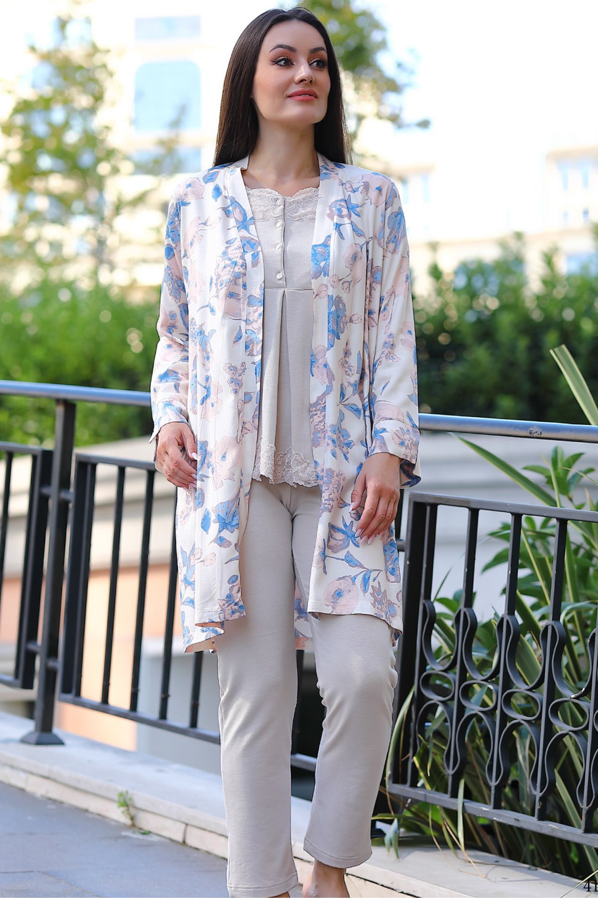 Kadın Sabahlıklı Lohusa Pijama Takımı Tuba 559 3lü Kadın Sabahlıklı Hamile Pijaması