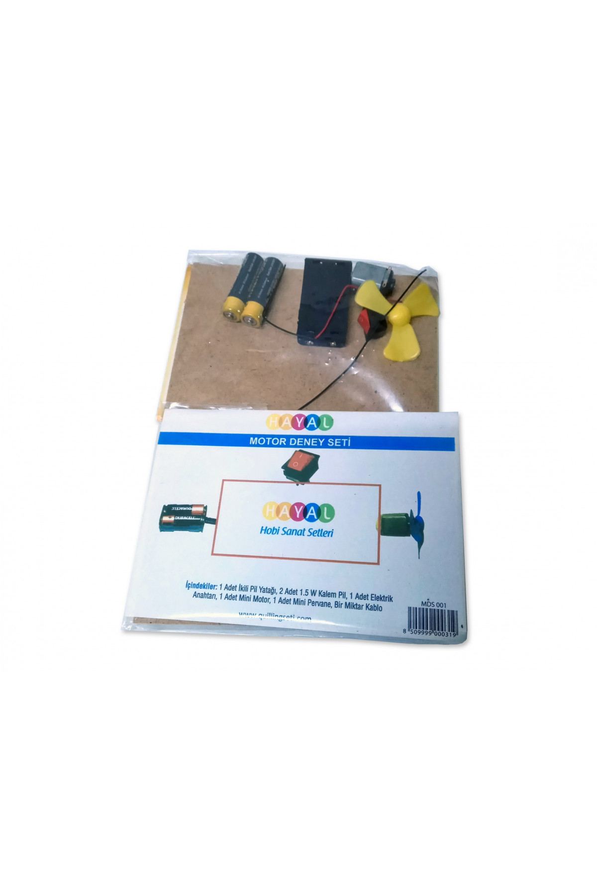 Motor deney seti içinde, ahşap zemin ile pil yatağı, kablo, mini motor, anahtar ve pervane bulunmaktadır.
