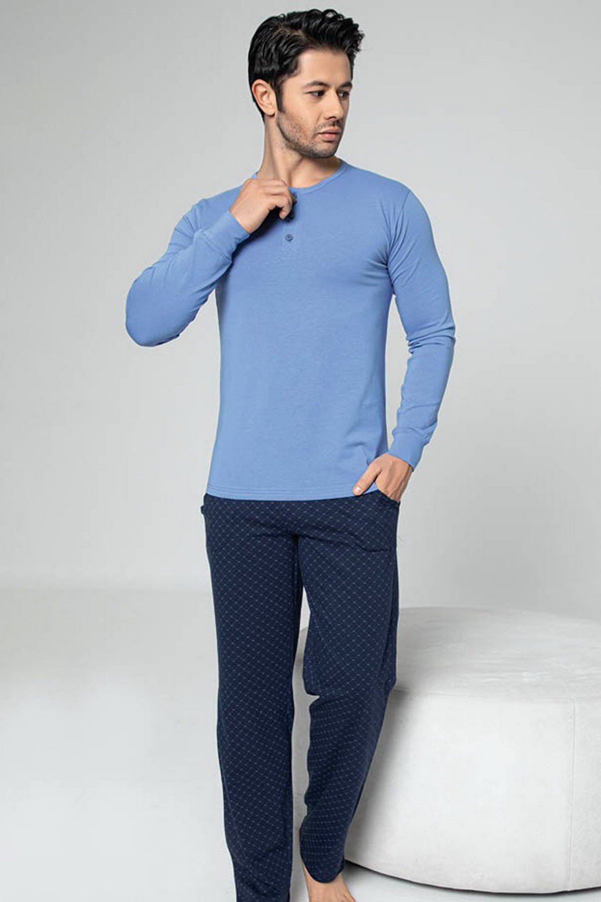 Pamuklu Kumaş Aydoğan Akare 331 Mavi Renk Pijama Takımı - Uzun Kollu Erkek Pijama Takımı
